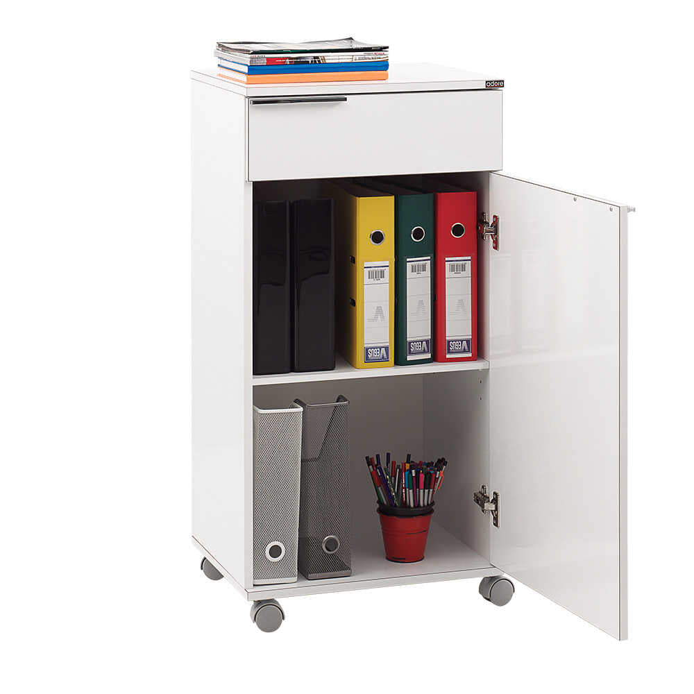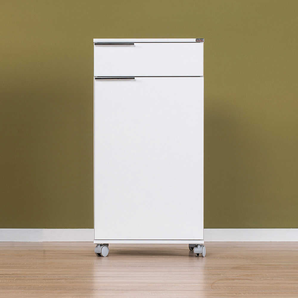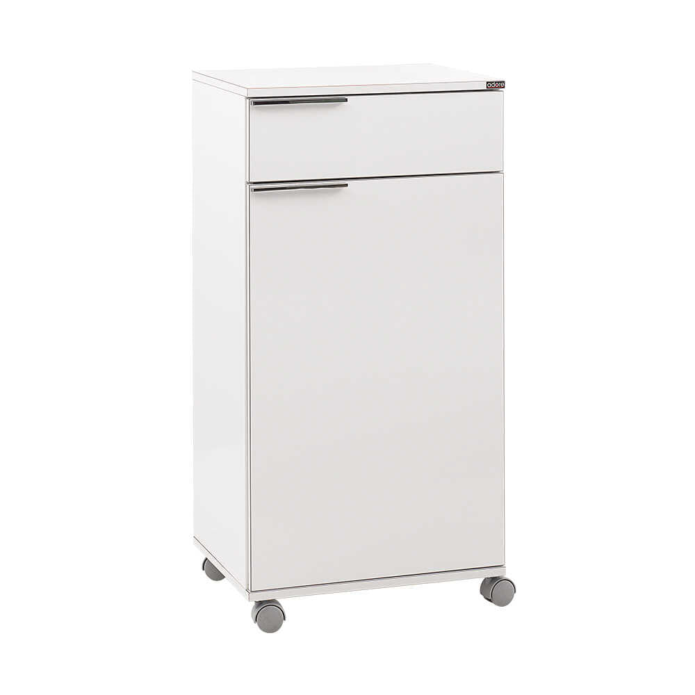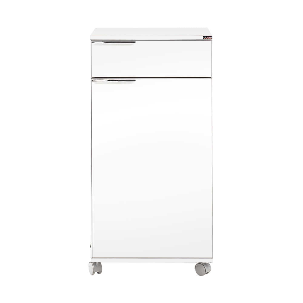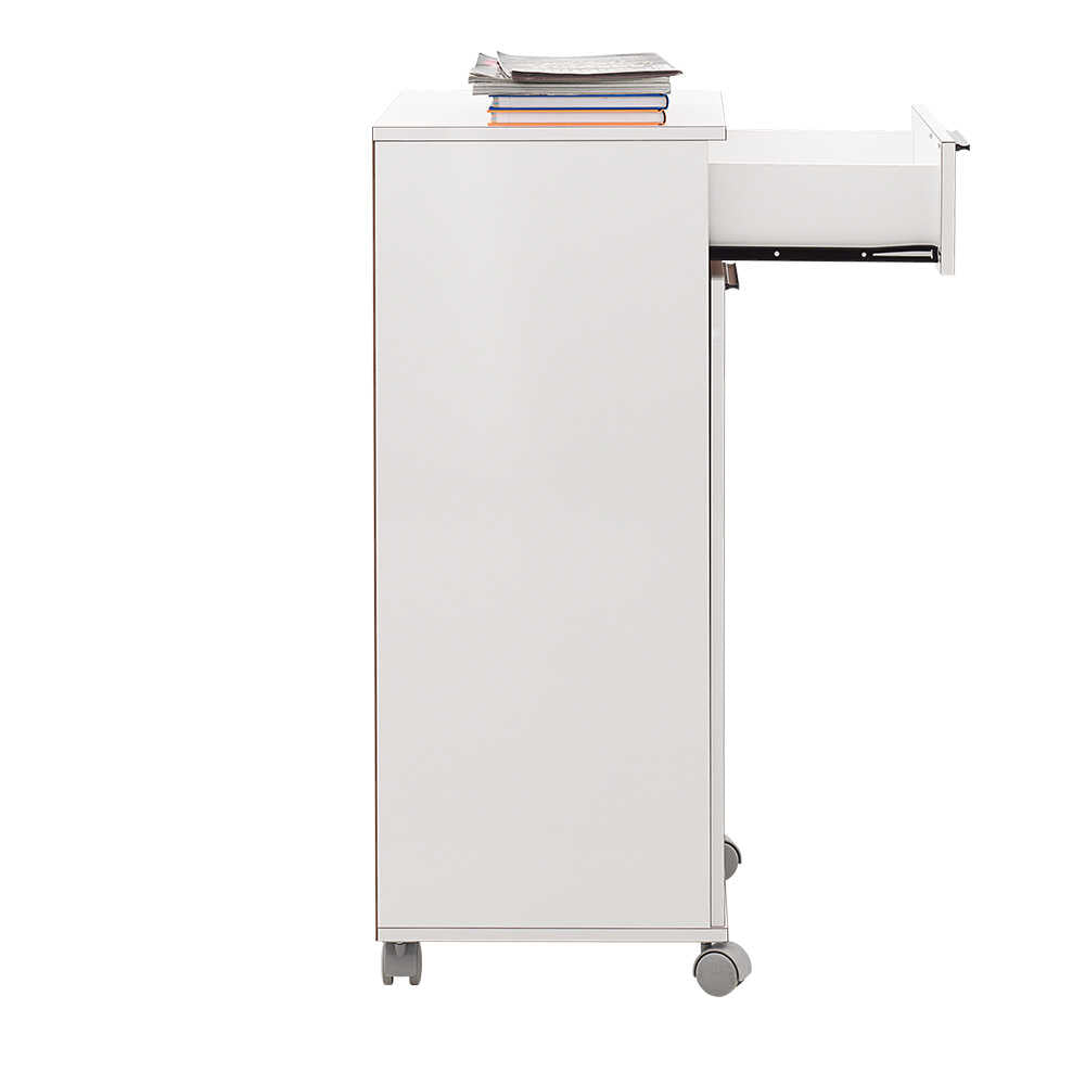 כוללת גלגלים, מגירה ודלת עם שני תאי אחסון פנימיים