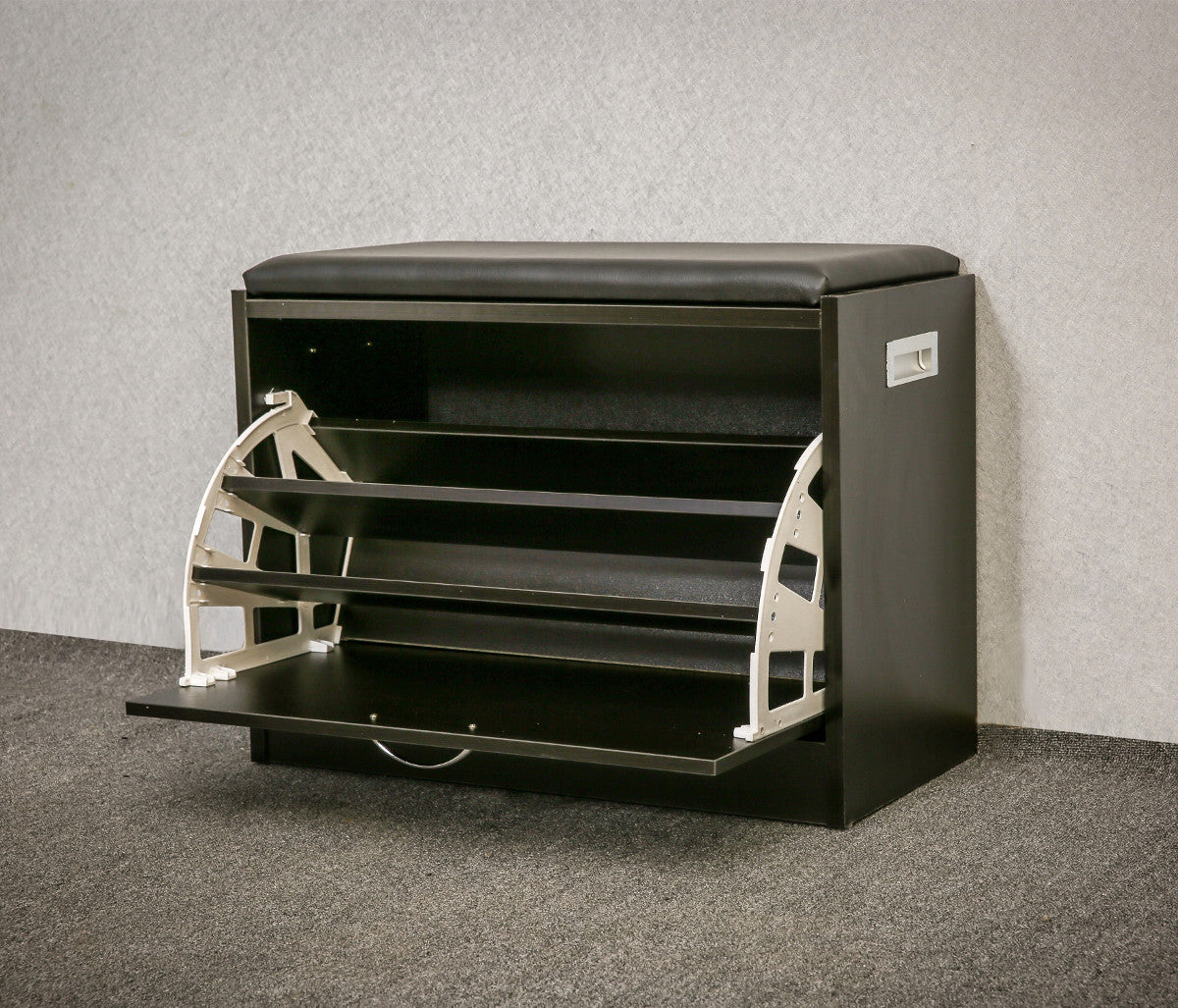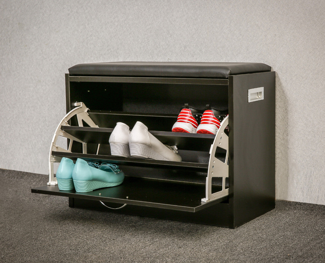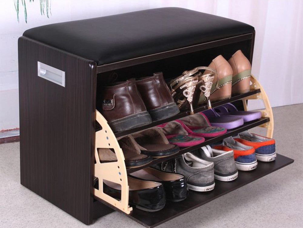 שידת התארגנות הכוללת מושב לישיבה ונעילת נעליים, ותא לאחסון הנעליים בצורה נוחה לשימוש ולשמירה עליהן.