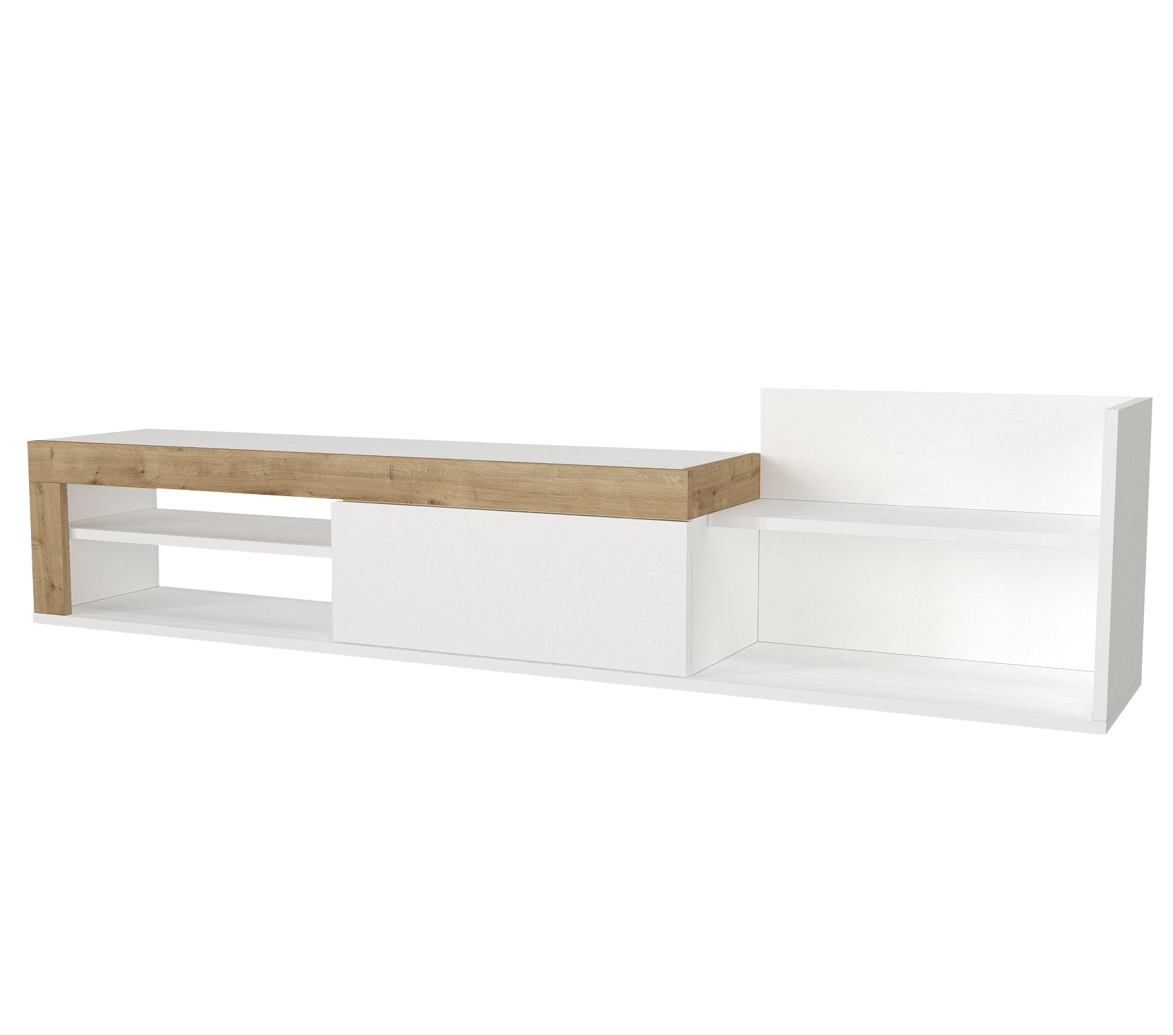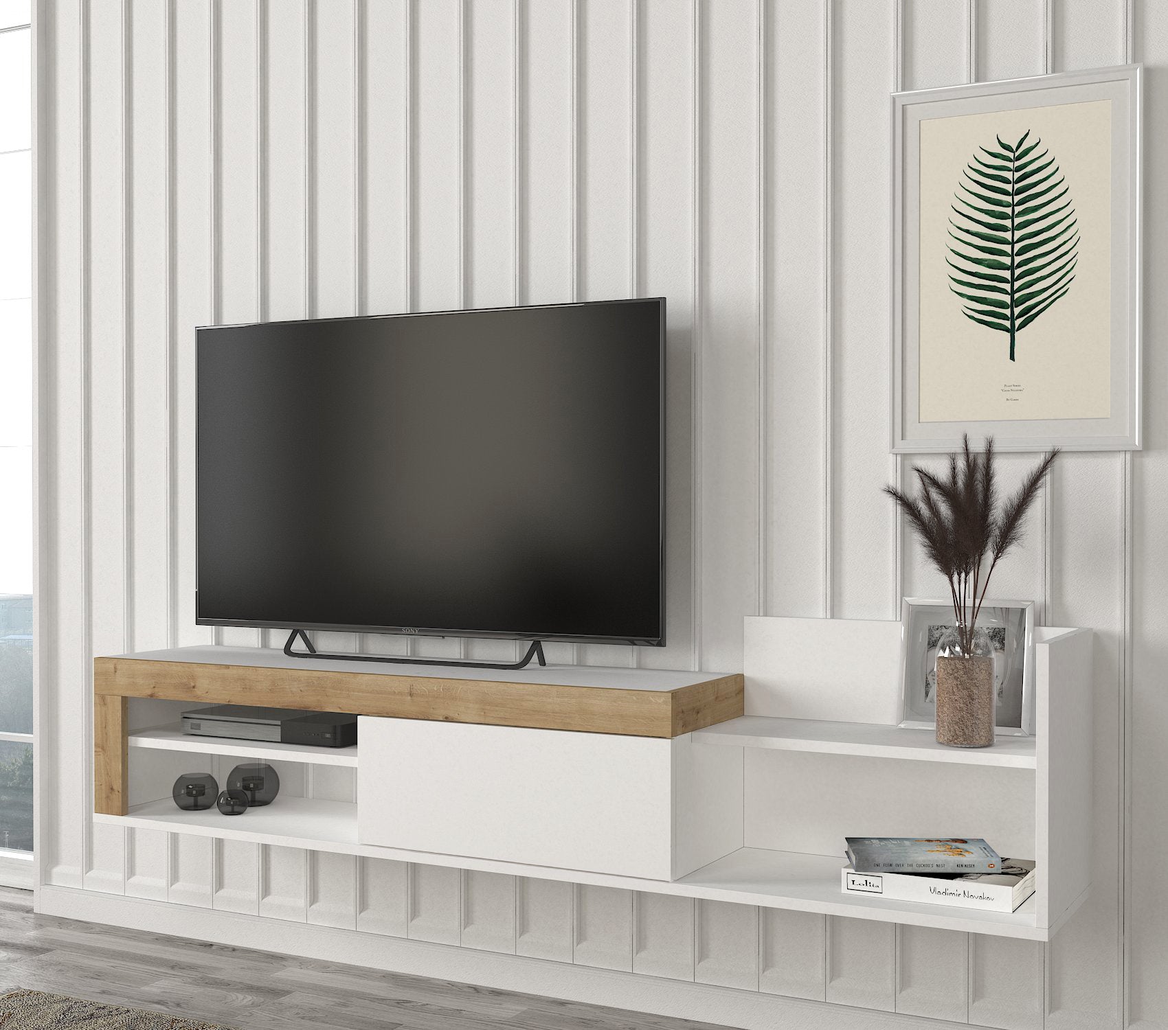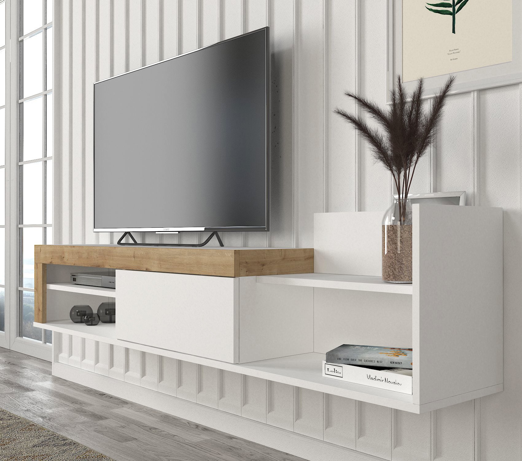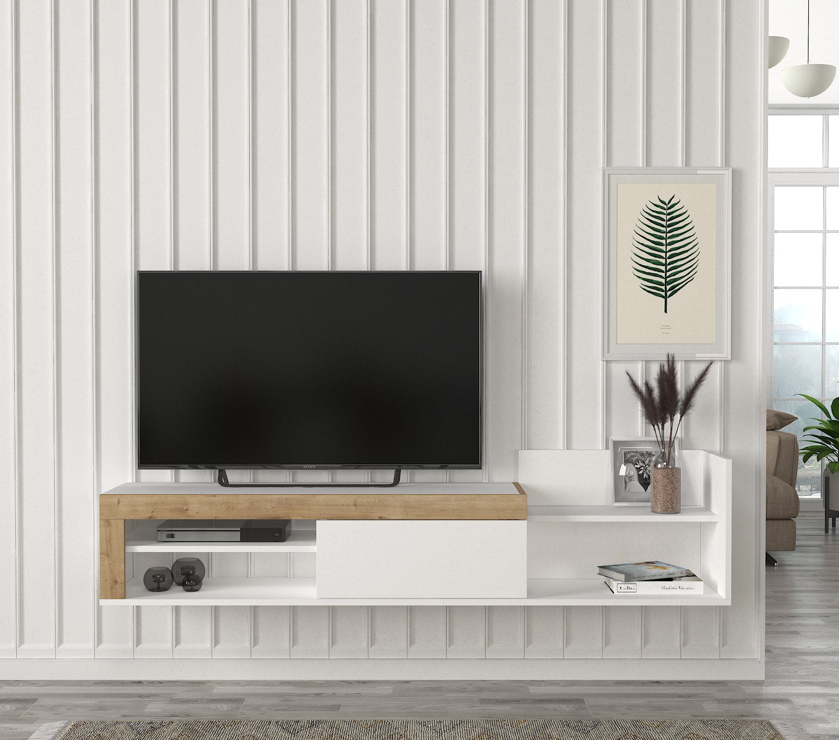 טרלה DE3951 - לבן משולב חום אלון - מזנון טלוויזיה צף