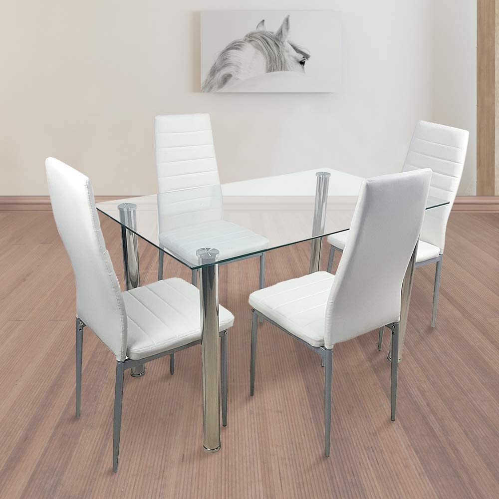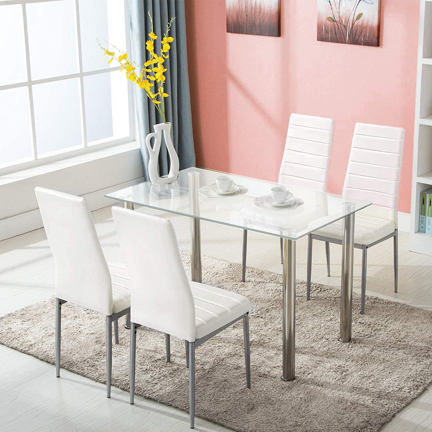 פינת אוכל בעיצוב מודרני הכוללת שולחן עשוי זכוכית מחוסמת במראה אלגנטי מיוחד וארבעה כיסאות תואמים.