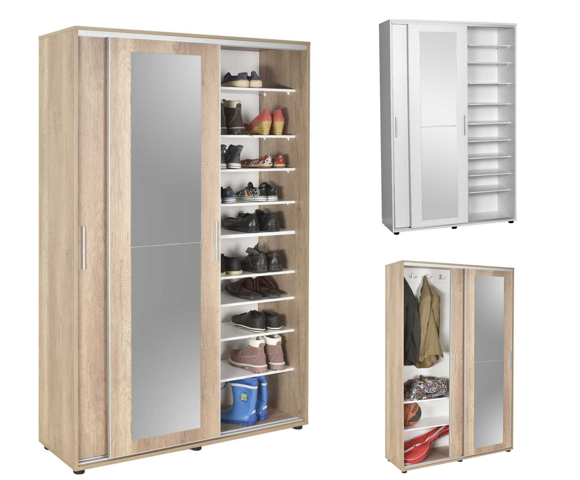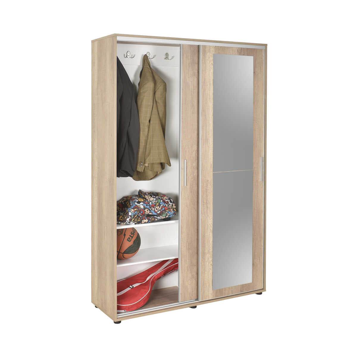 לארון 14 מדפי אחסון נוחים (10 בצידו הימני ו-4 נוספים בצידו השמאלי) וארבעה ווי תליה כפולים למגוון שימושים כגון תליית תיקים, כובעים ומעילים.