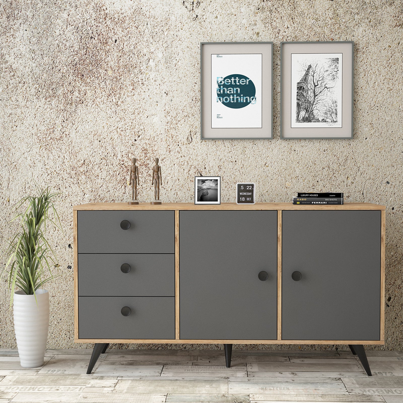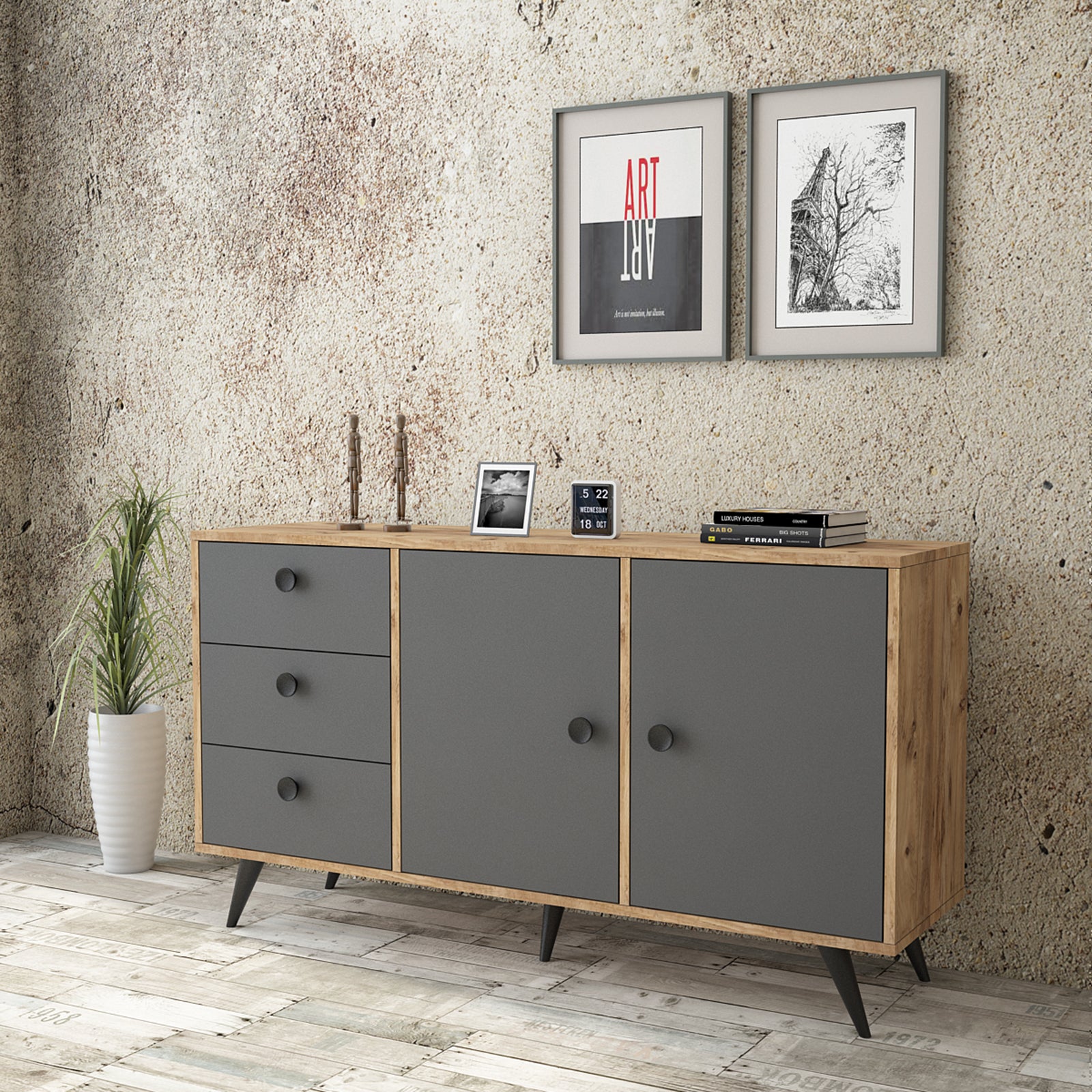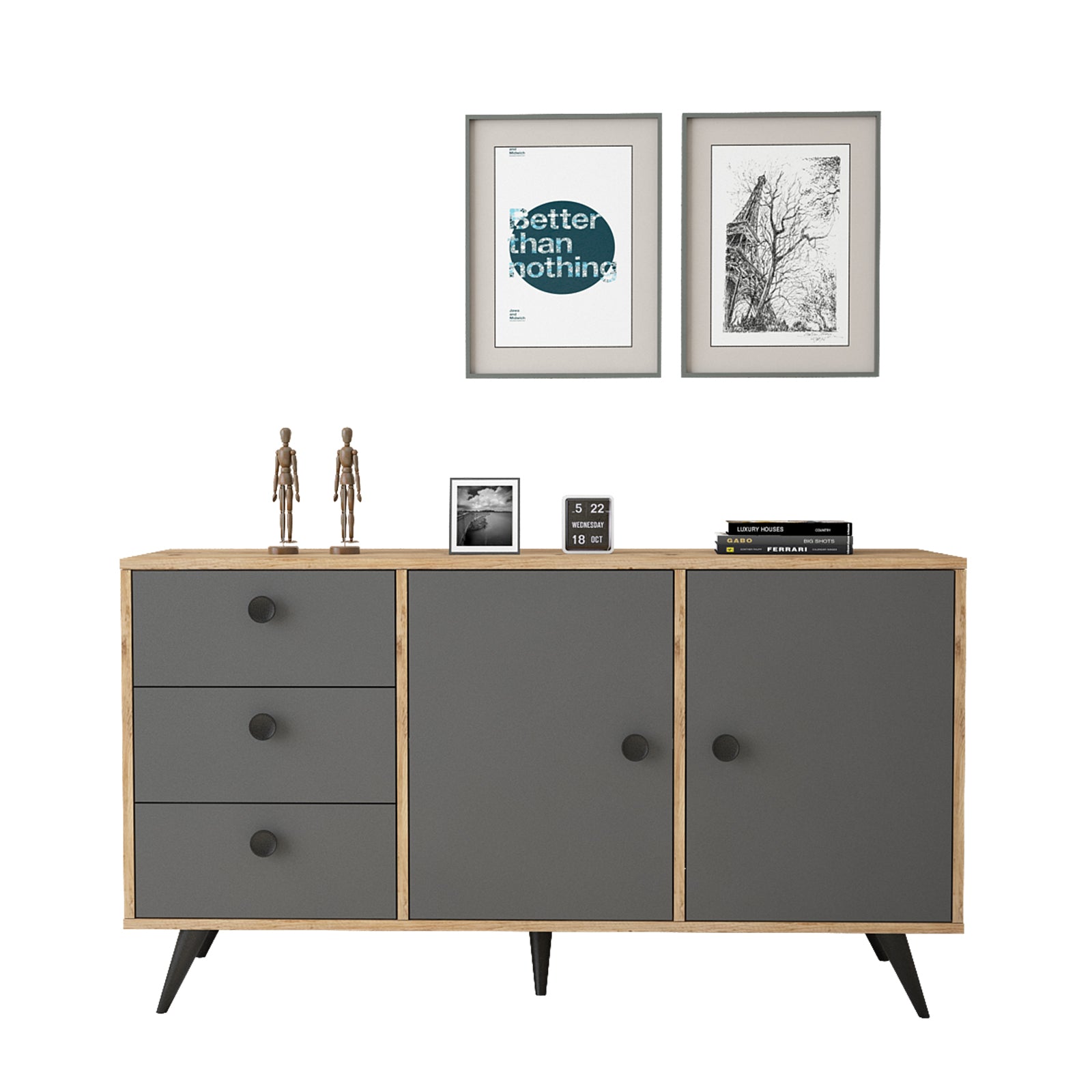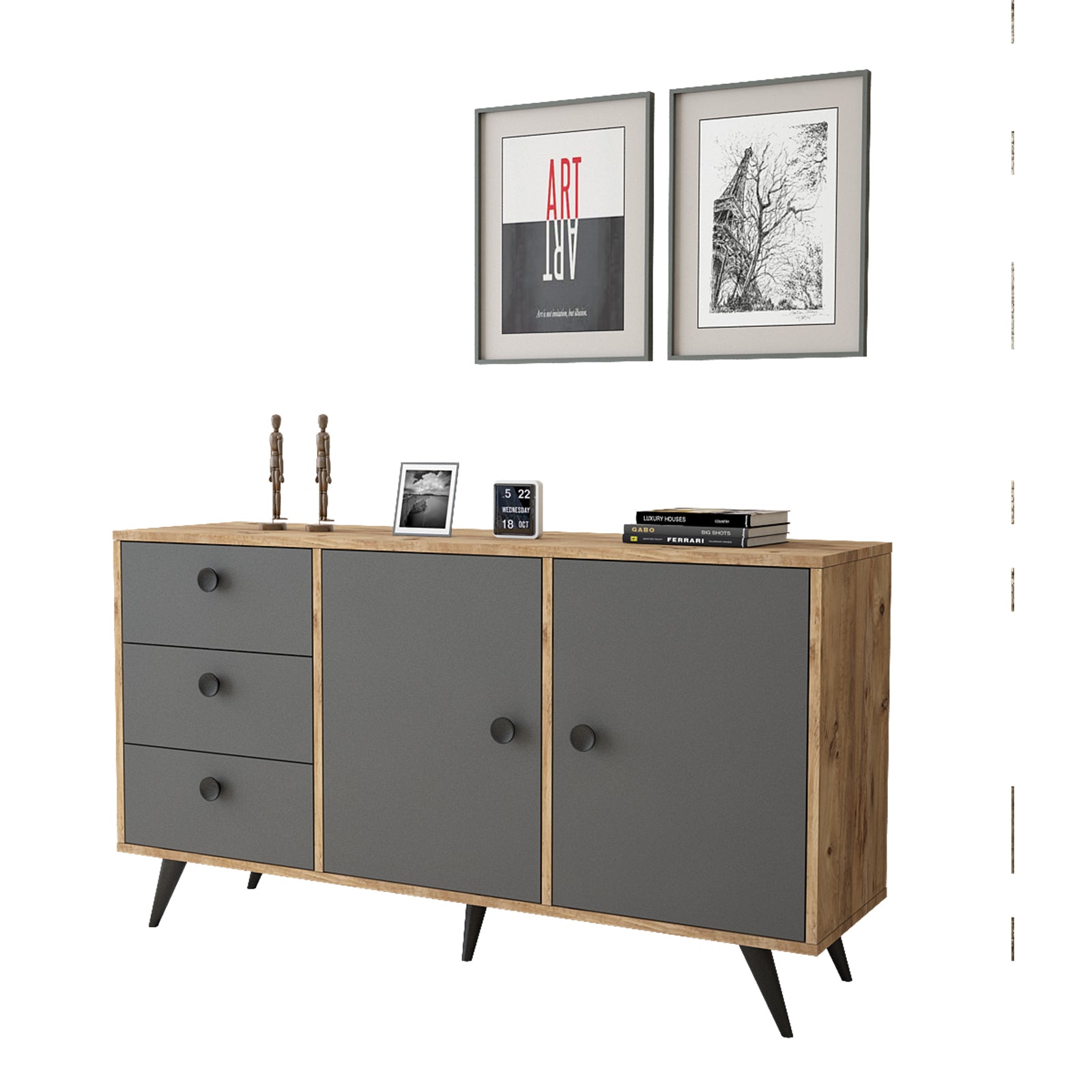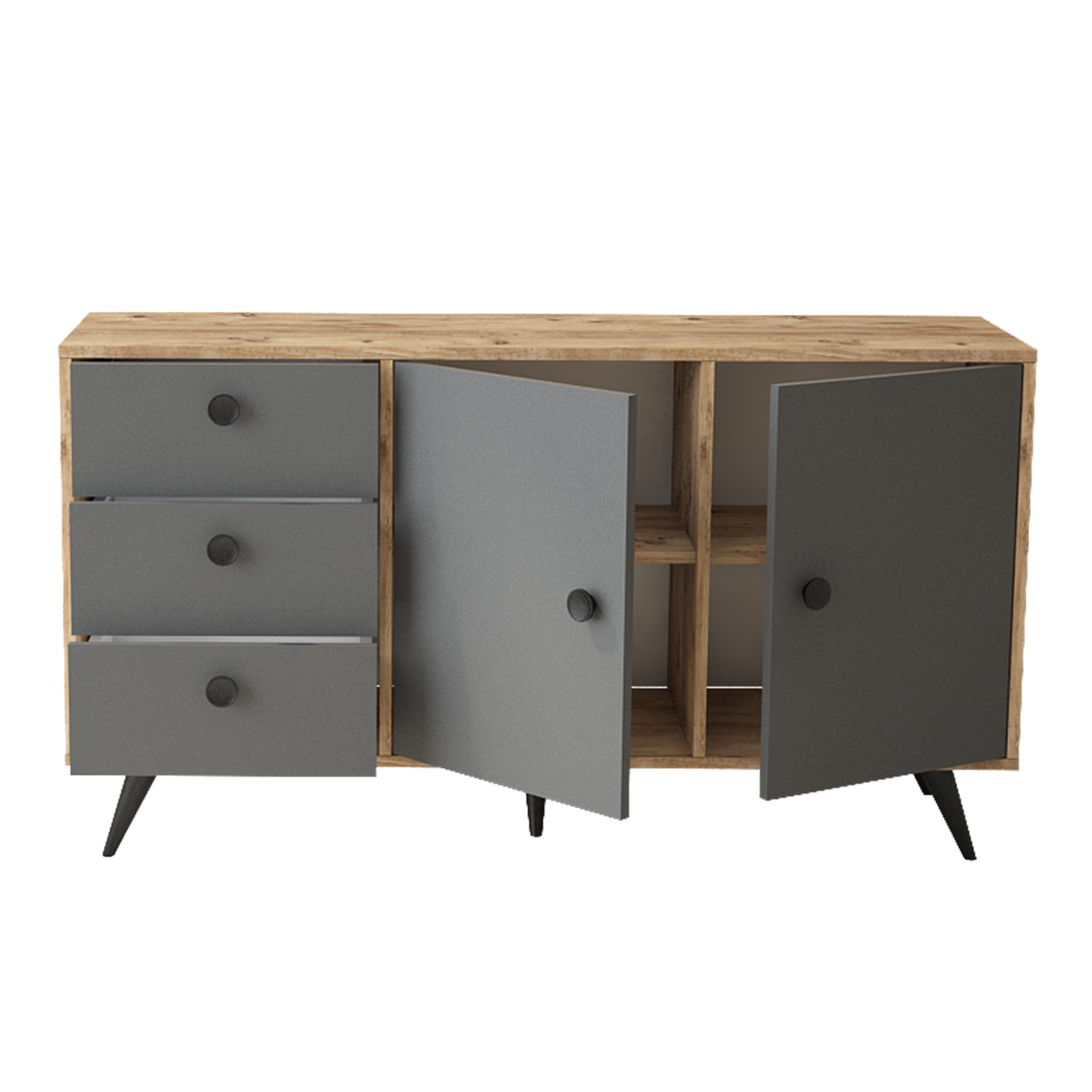 יפה, נוחה ושימושית במיוחד בעלת 2 דלתות ו-3 מגירות, כל דלת בעלת מדף המחלק את החלל לשני חללי אחסון מרווחים.