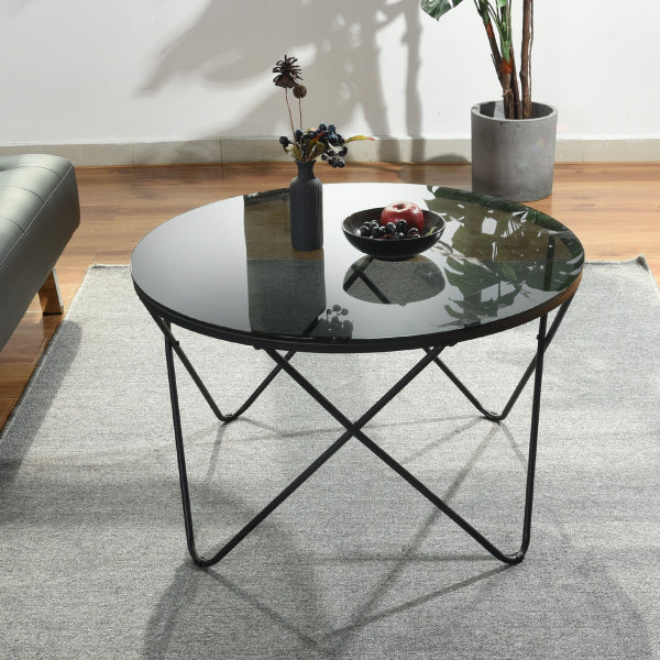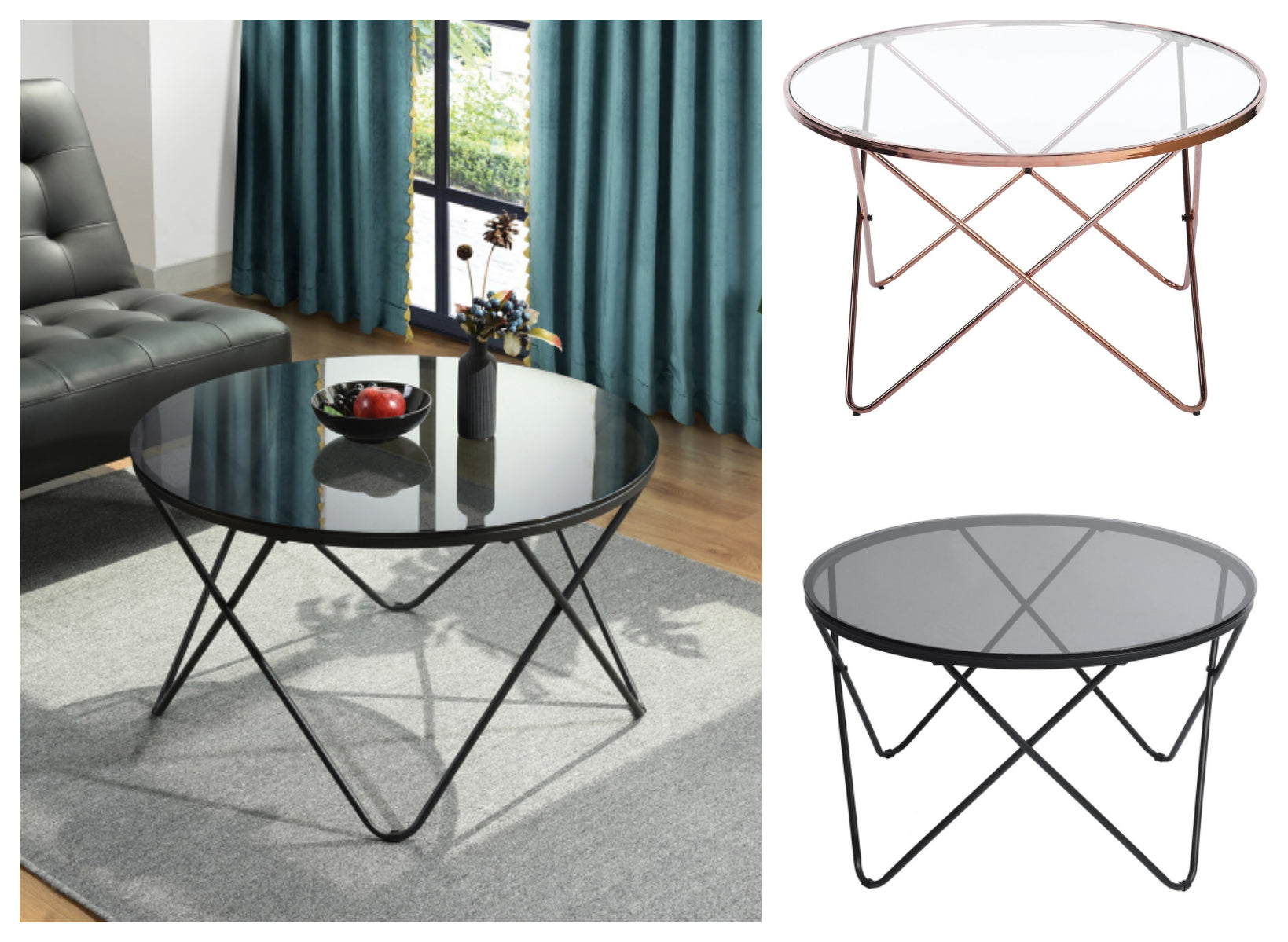 שולחן קפה עגול בעיצוב חדשני בשילוב יוקרתי של זכוכית מחוסמת בגוון מעושן ומתכת בשני צבעים לבחירה.