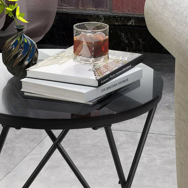 שולחן צד עגול בעיצוב חדשני בשילוב יוקרתי של זכוכית מחוסמת בגוון מעושן ומתכת.