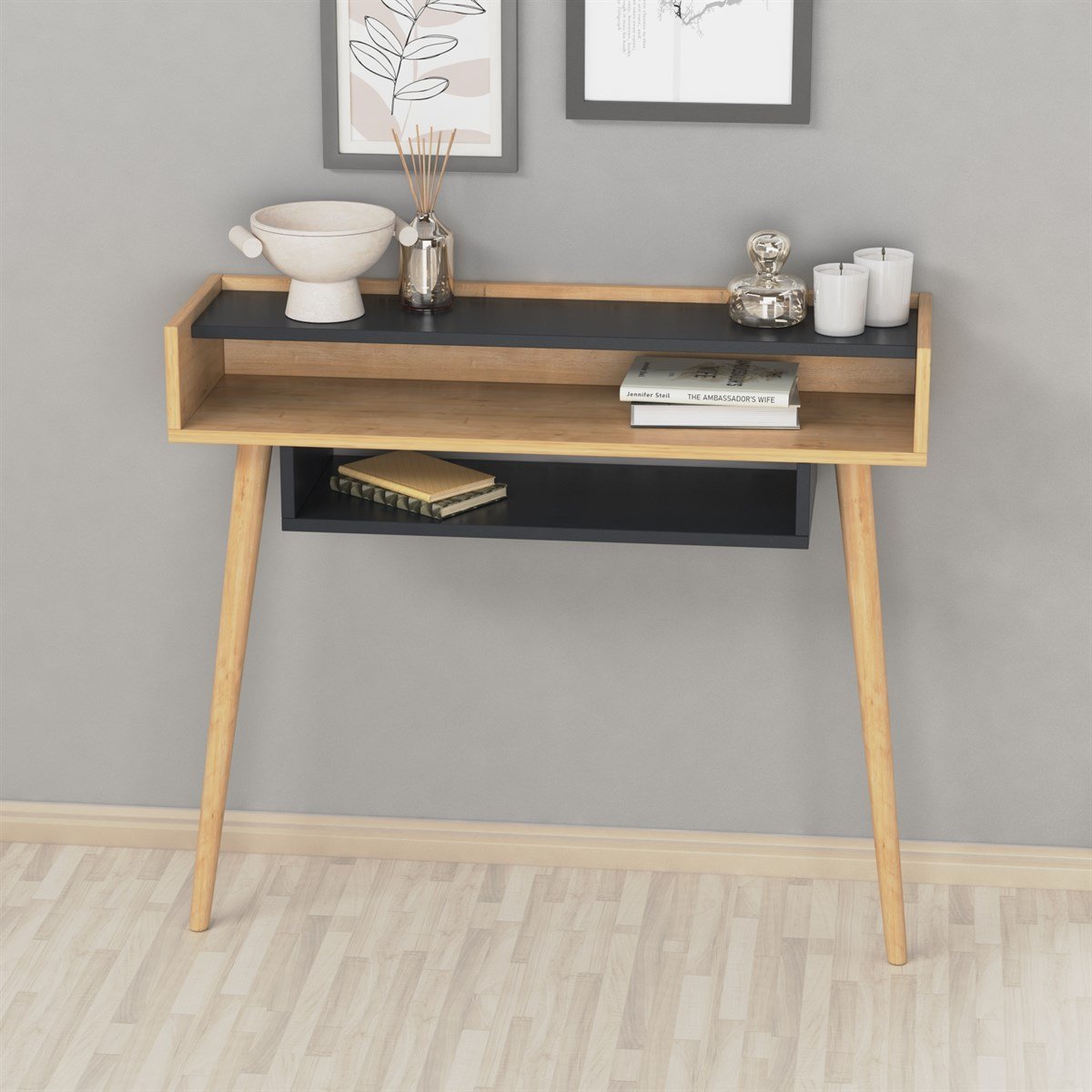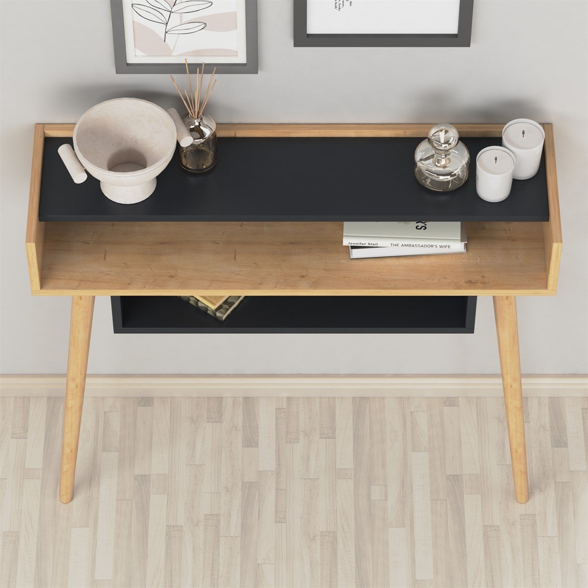 קונסולה מקובעת לקיר בעלת מדפים פתוחים ומציעה פתרון פונקציונלי להציג חפצים דקורטיביים ואחסון פריטים יומיומיים כגון: מפתחות, משקפי שמש וכד'.
