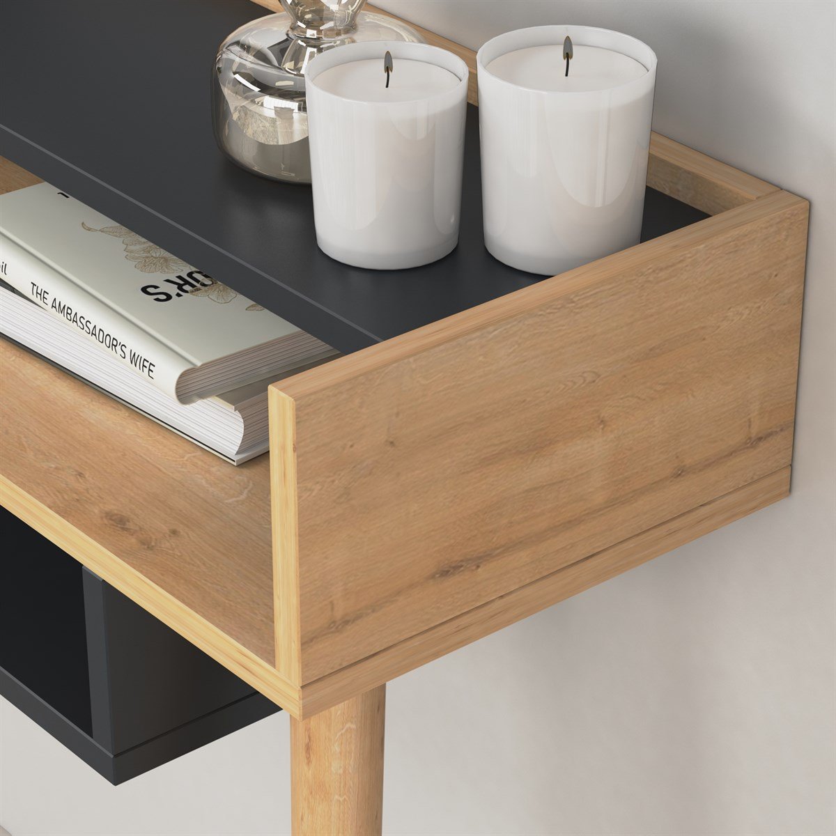 המדפים משולבים בחלק העליון המוגבה של הקונסולה והופכים את האחסון לנגיש ונח ומסייעים בשמירה על הסדר.