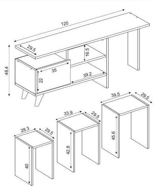 מתאים לטלוויזיה והנחת פרטי נוי לעיצוב חלל החדר ומאפשר מקום אחסון נגיש ונח. השולחנות נערמים אחד מעל השני ונכנסים מתחת לגוף המזנון ובכך חוסכים מקום, נשלפים בקלות ומאפשרים אירוח קל ונח.