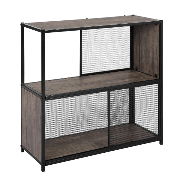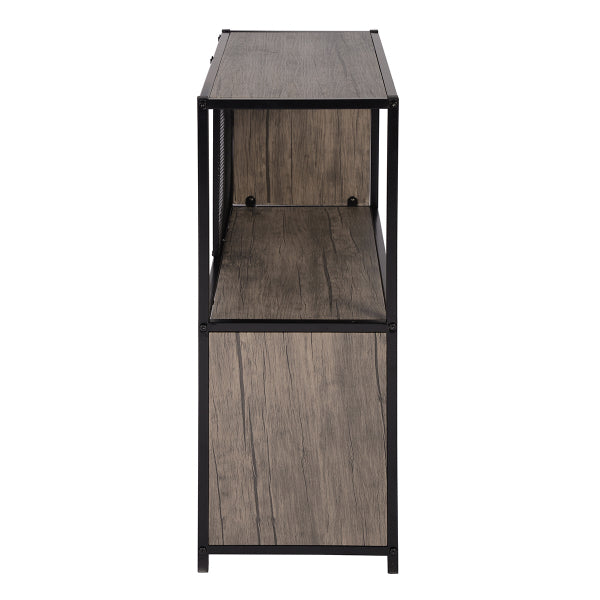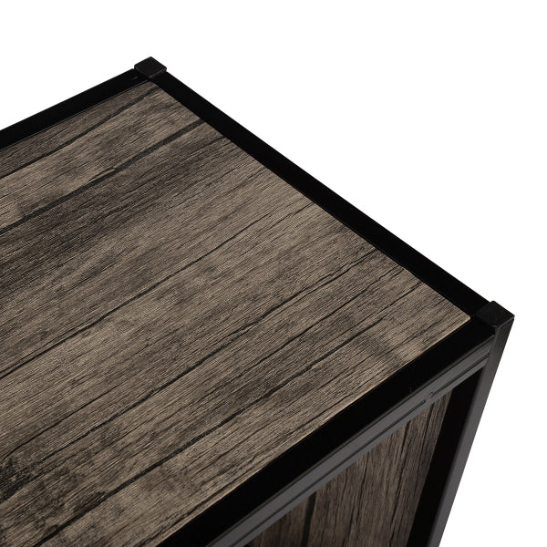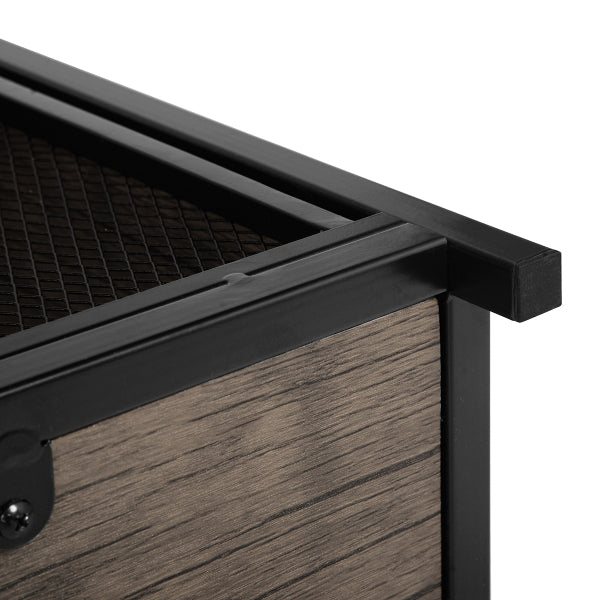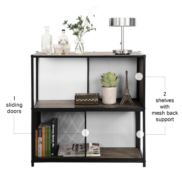 השידה משולבת רשתות גב לתמיכה ודלת הזזה יחידה העשויות מתכת שחורה המעניקות לשידה מראה ייחודי ומעוצב.