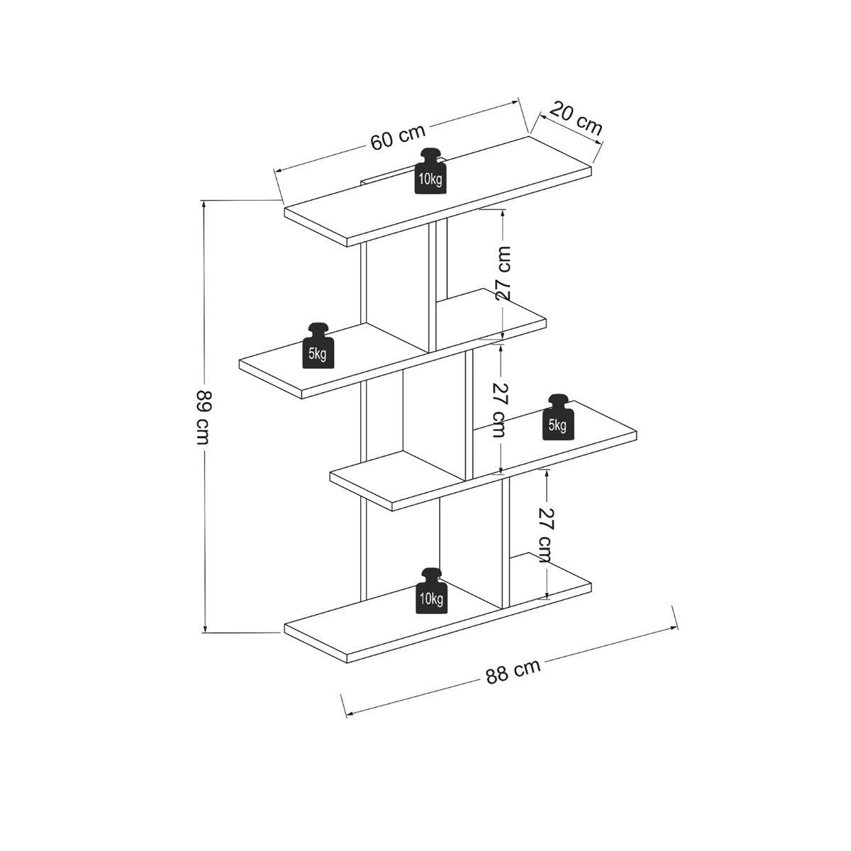 יחידת מדפים דקורטיבית המונה 4 מפלסי מדפים המחולקים באופן אסימטרי.