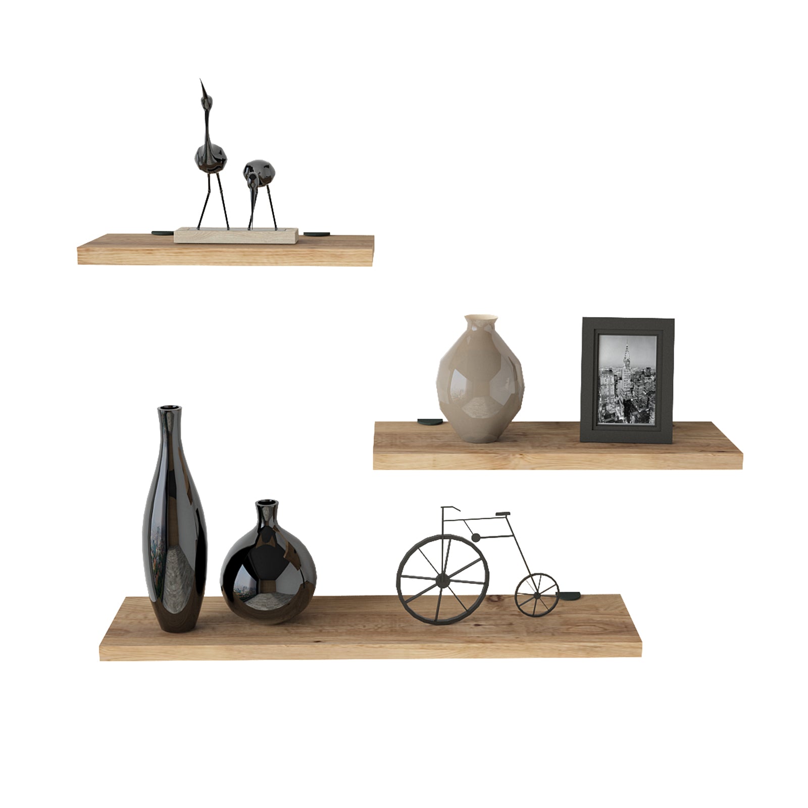 שלישיית מדפים צפים באורכים שונים לעיצוב חלל הבית.