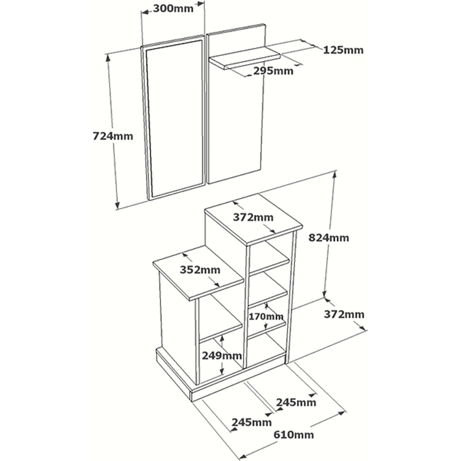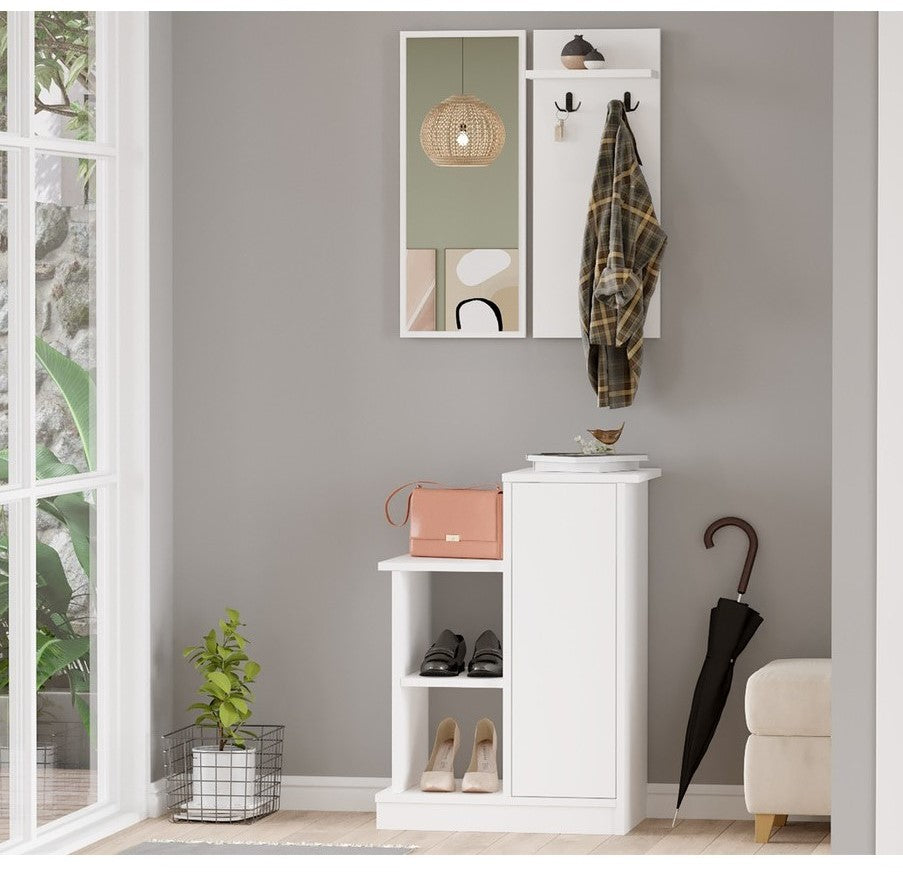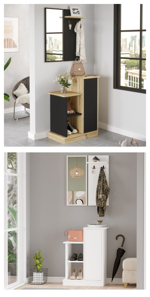 היחידה בעלת מראת תליה, מדף עם ווים לתליה ויחידת אחסון תחתונה עם 2 מדפים ודלת.